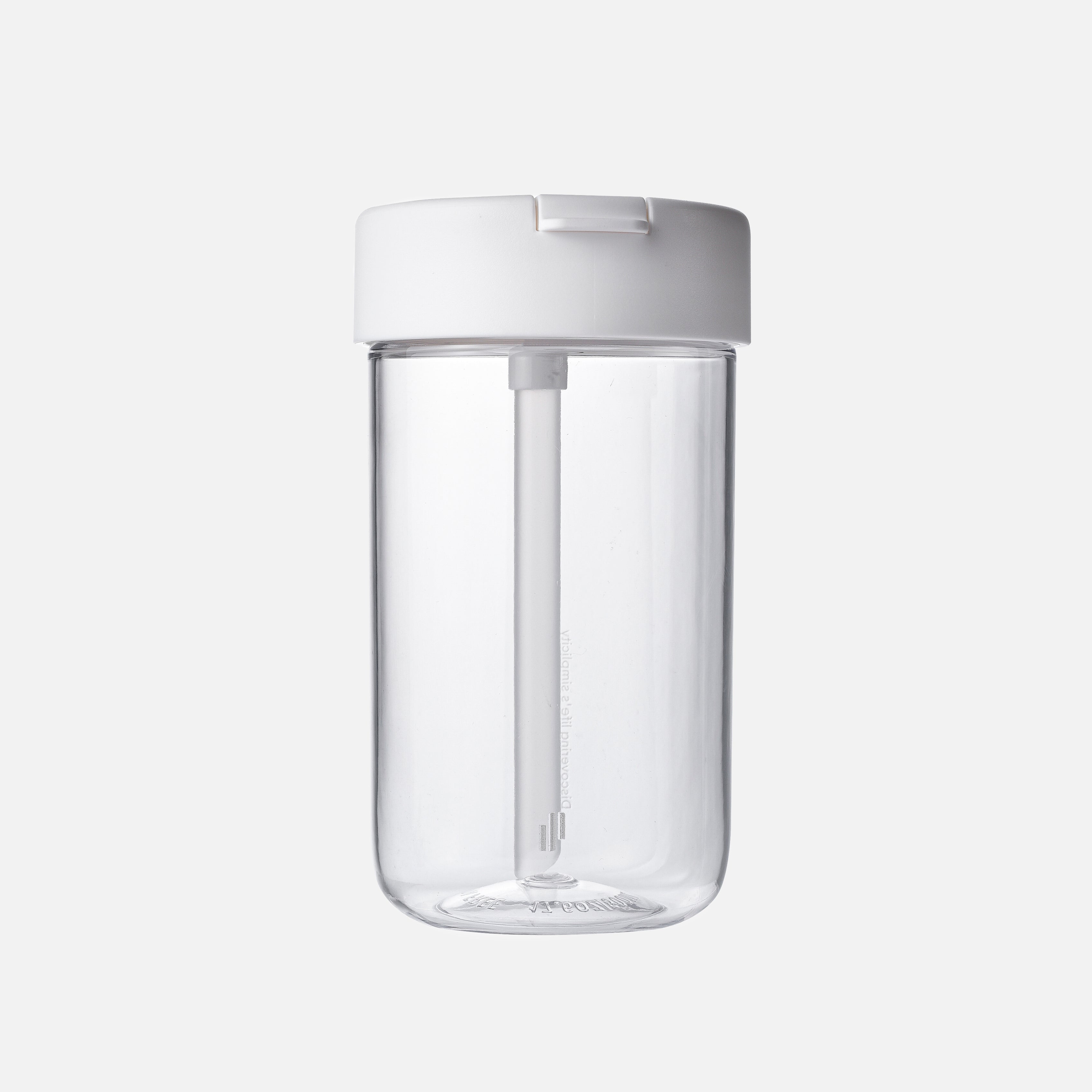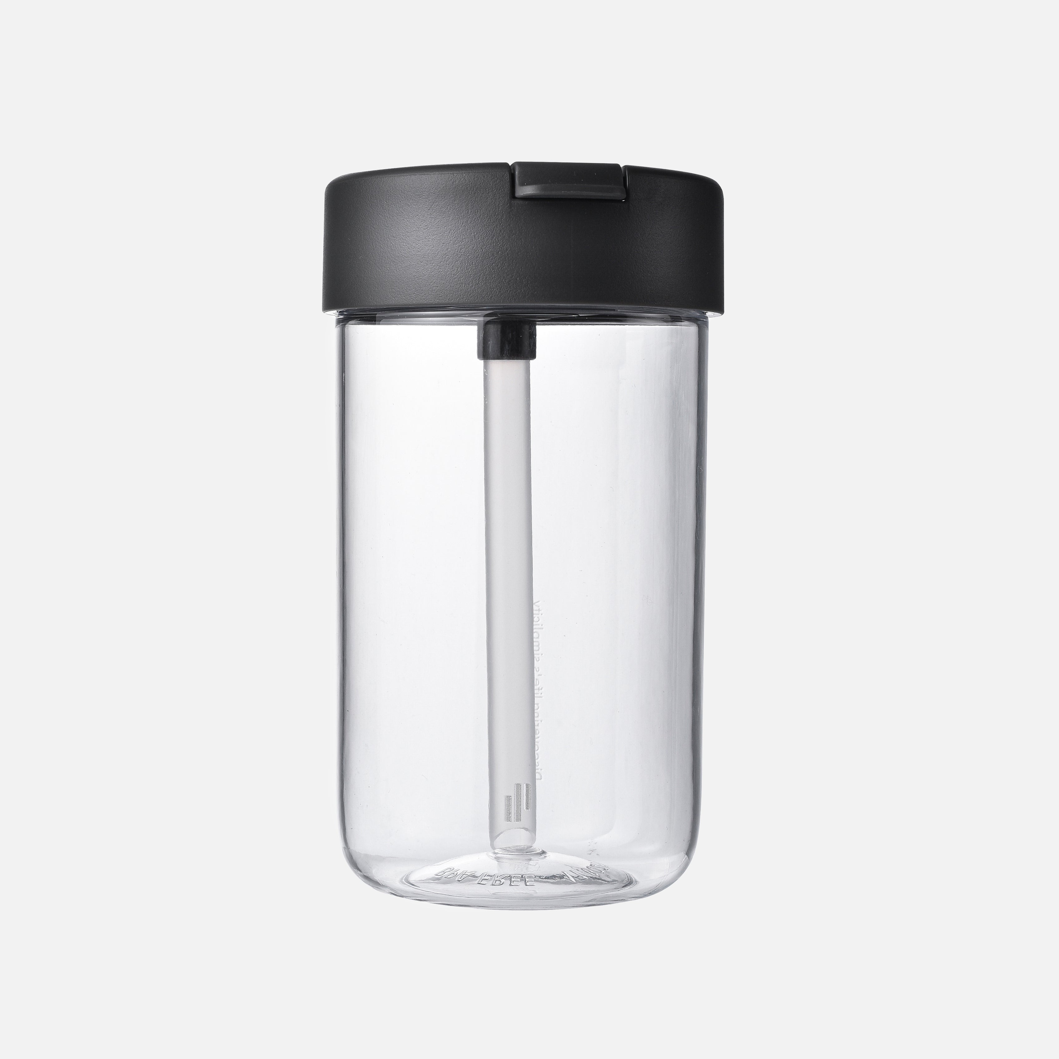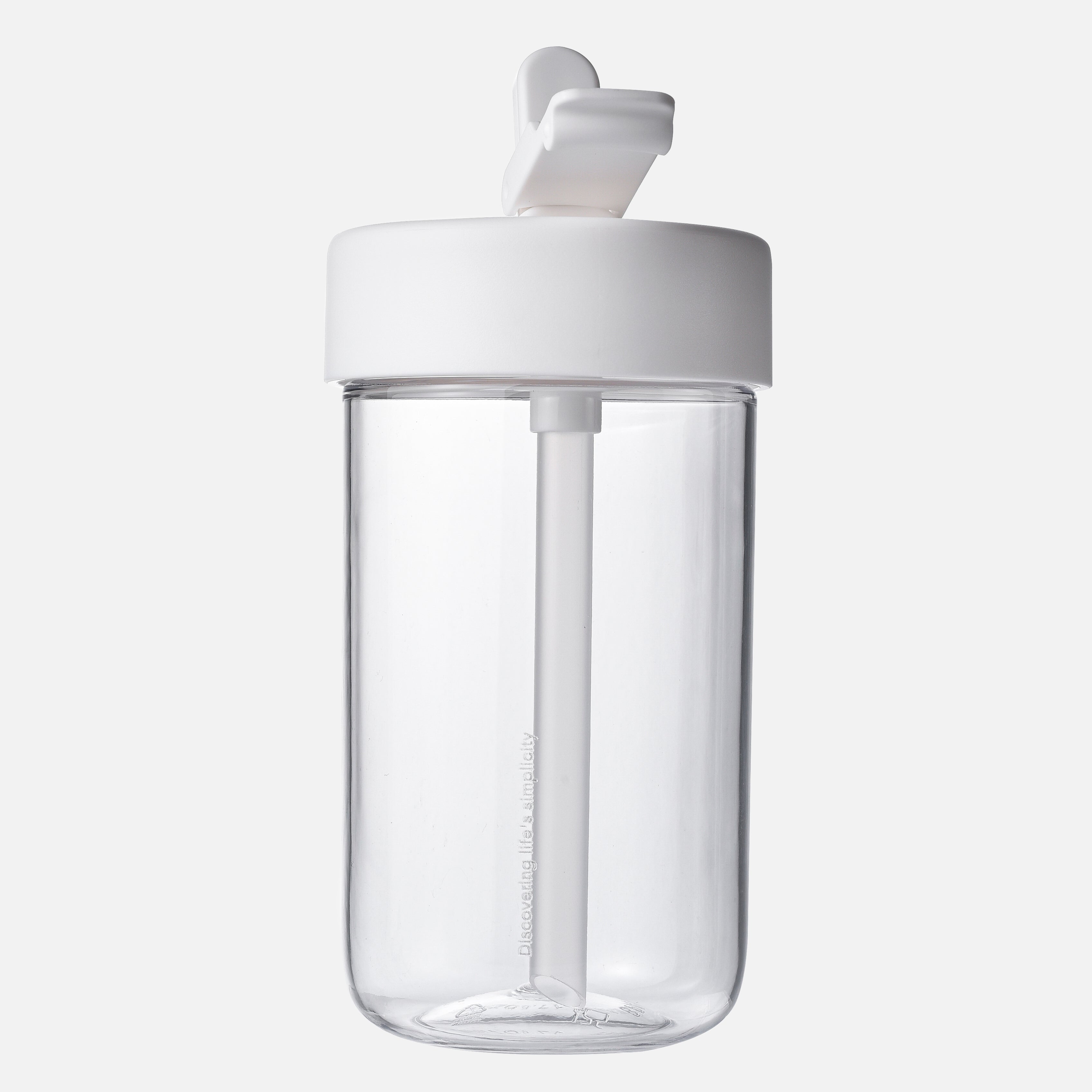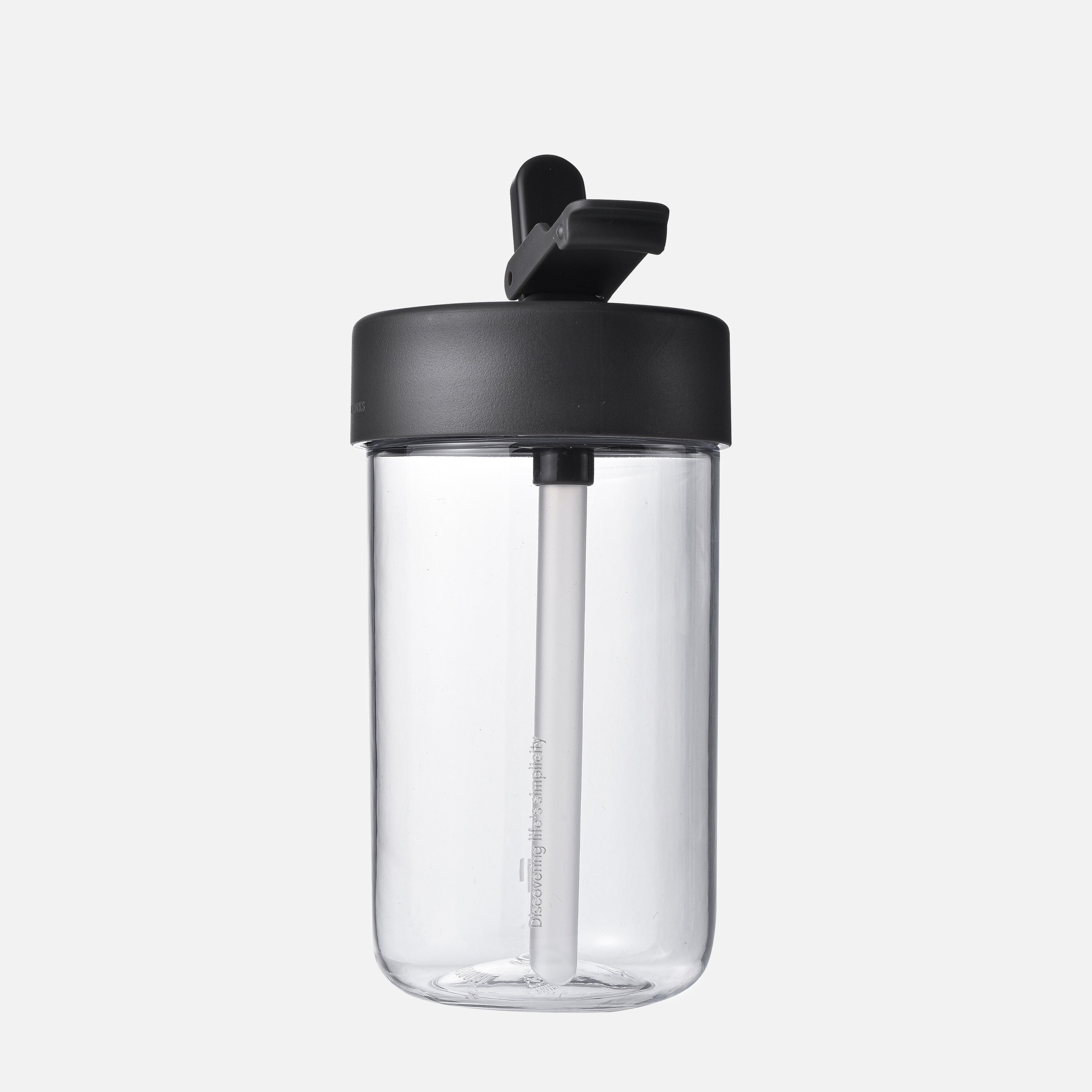 A transparent bottle with a sleek, modern design which features a lid with a flip-top spout and a built-in straw extending into the bottle. The overall design is minimalist and functional - suitable for everyday use, either for water or other beverages.